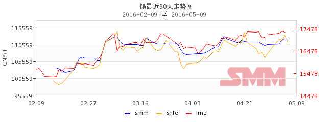 SMM錫簡(jiǎn)評(píng):今日開(kāi)盤(pán)112340元/噸,受到周末公布的中國(guó)4月對(duì)外貿(mào)易數(shù)據(jù)疲弱的打壓,國(guó)內(nèi)商品市場(chǎng)普遍遭遇重挫,滬期錫主力一路震蕩下行,最低觸及110030 元/噸,最終收盤(pán)110770元/噸,較前一日下跌590元/噸,跌幅0.53%。成交33068手減8242手,持倉(cāng)10624手減242手。