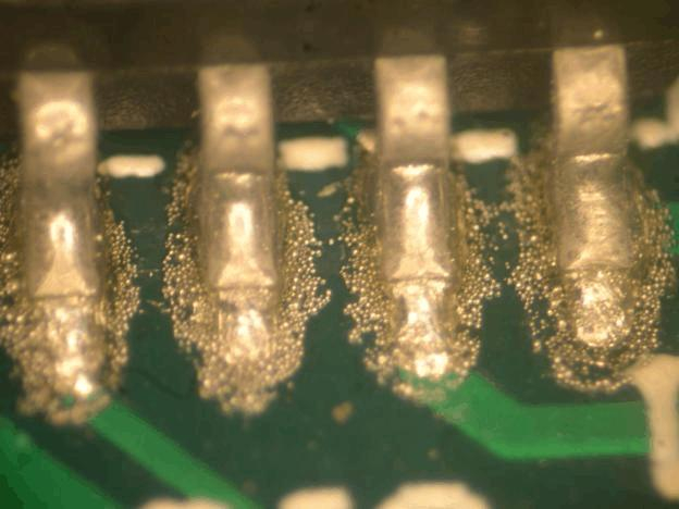 錫球大多數(shù)發(fā)生在PCB零件面,由于PCB過錫時未干的助焊劑揮發(fā),或者空氣中水汽太多,當這些水分接觸到高溫的熔錫時,氣體大量膨脹,造成錫的爆發(fā),錫就被噴涌而出形成錫球。
